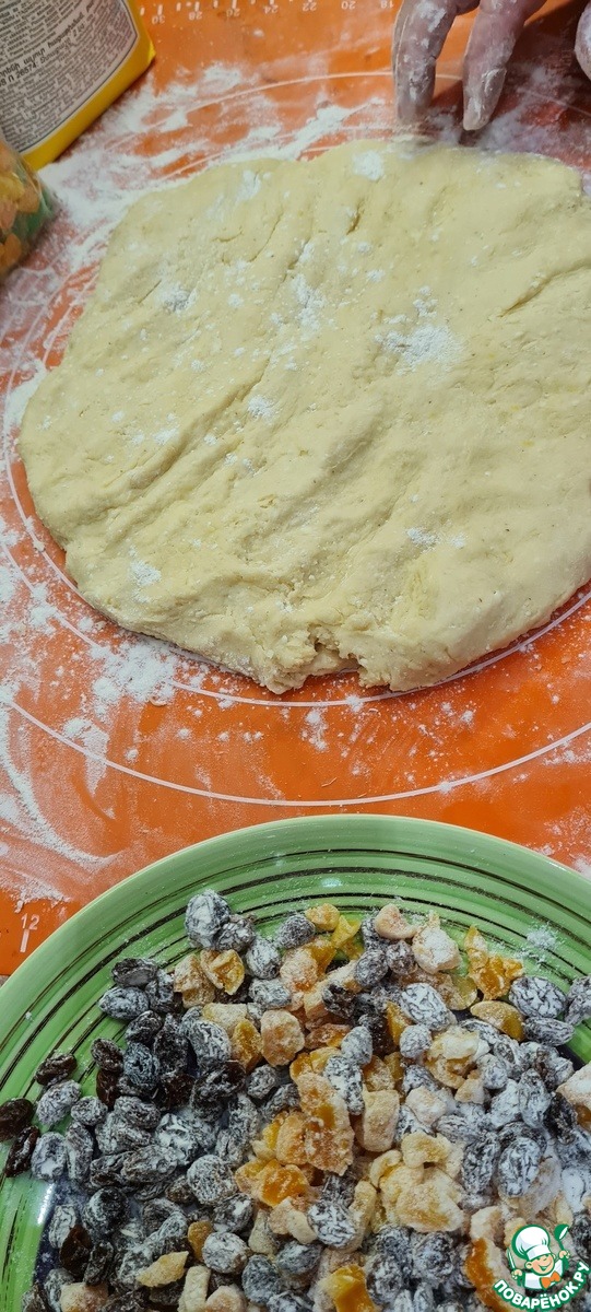 4. Сухофрукты просушить салфеткой и обвалять в муке, добавить всё в тесто и вымесить. -