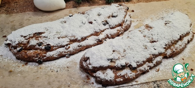 6. Тёплый Штоллен смазать обильно растопленным сливочным маслом и посыпать обильно сах. пудрой.