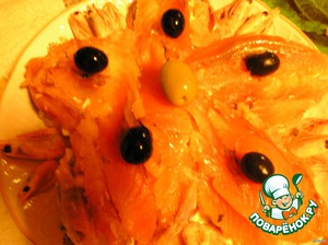 Украшаем оливками и креветками.