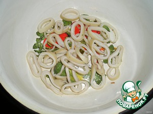 Отвариваем кальмарчиков, нарезаем колечками