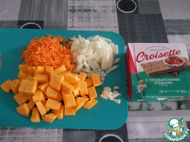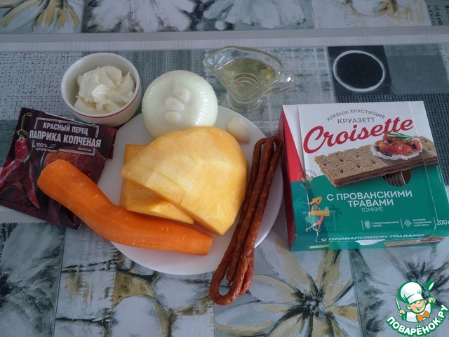 Ингредиенты для «Тыквенный суп с колбасками и хлебцами»: