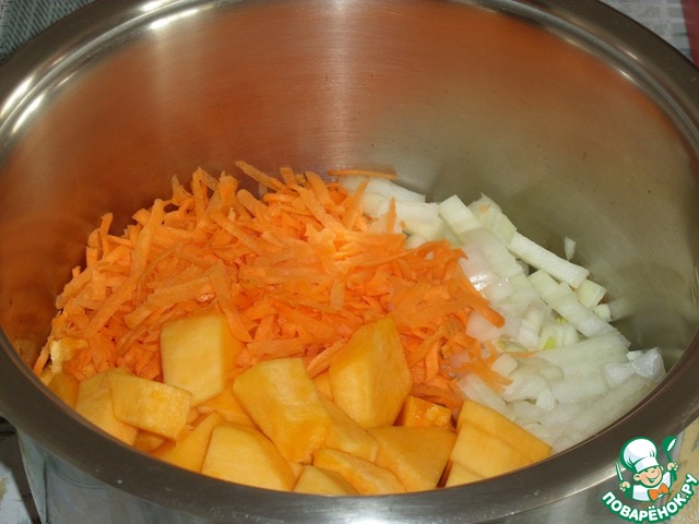 Кастрюлю с толстым дном ставим на огонь. Хорошо разогреваем. Наливаем в нее растительное масло и выкладываем нарезанные овощи.