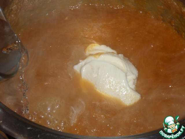 Добавляем в кастрюлю плавленный сливочный сыр и 250 мл воды.
