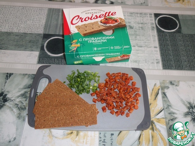 Мелко нарезаем копченые колбаски и зеленый лук. Вынимаем из упаковки необходимое количество хлебцев.