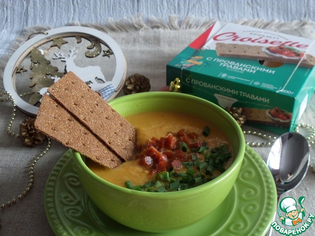 Праздники - это веселье, радость и, конечно же, вся семья в сборе. После зимних прогулок всей семьей, отлично согреться и насытиться поможет горячий ароматный суп. Сегодня у нас тыквенный суп с копчеными колбасками и хрустящими хлебцами с прованскими травами ТМ "Kruazett ". Пробуйте!)