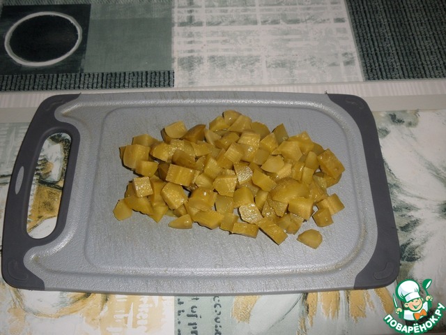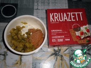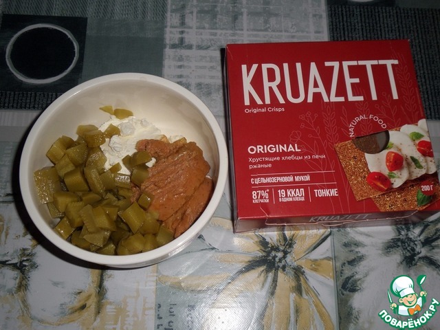 Выкладываем в миску нарезанные маринованные огурцы, творожный сыр, паштет из тунца.