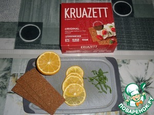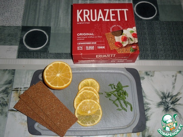 На каждый хлебец выкладываем 1,5 - 2 ч. л. приготовленной намазки. Затем выкладываем на хлебец пару ломтиков лимона и нарезанный зеленый лук.