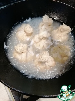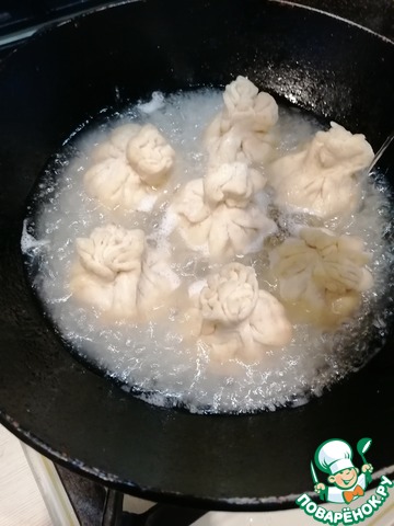 В сковороде разогреть растительное масло, поставить туда мешочки, залить холодной водой, чтобы они были покрыты до середины. Закрыть крышкой и тушить, пока вода не выпарится на очень сильном огне. Потом поливать маслом из сковороды мешочки несколько раз и тушить еще минут 5. пока мешочки не станут хрустящими.