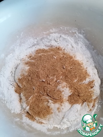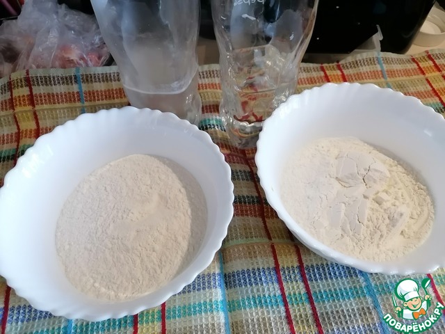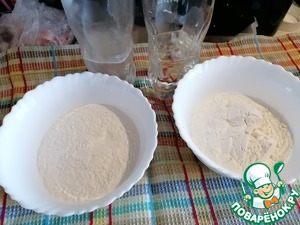Разделить муку на две части в разные миски.