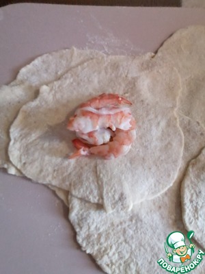Кусочки обвалять в муке и раскатать на тонкие кружки и положить на них 3 креветки. -