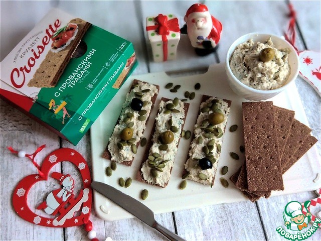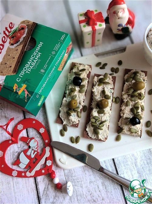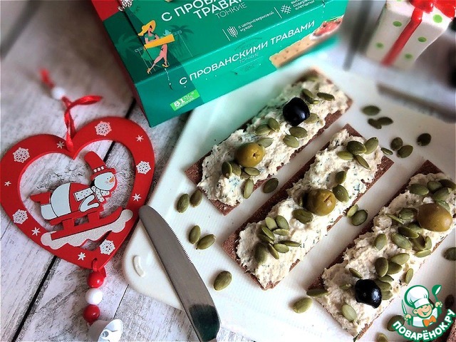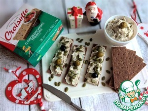 Намазываем хлебцы паштетом. Для праздничной подачи я бутерброды дополню тыквенными семечками, оливками и маслинами. Это по желанию. Бутерброды намазывайте непосредственно перед подачей или в процессе употребления, чтобы хлебцы оставались хрустящими.