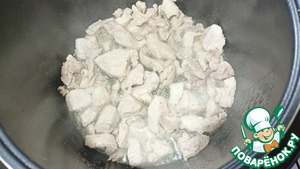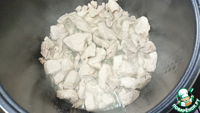 Отправляем в чашу масло и свинину — Режим «Жарка» 15 минут. (Не забываем перемешивать каждые 3-5 минут). Желательно готовить с открытой крышкой. После чего 2 минуты дать чаше остыть.