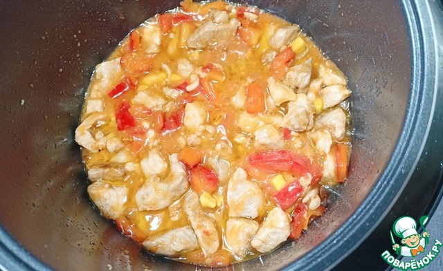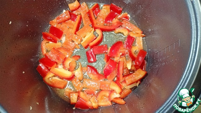 Достаем свинину и отправляем на жару перец - Режим "Жарка" 4 минуты. (Не забываем перемешивать каждые 1-2 минуты).