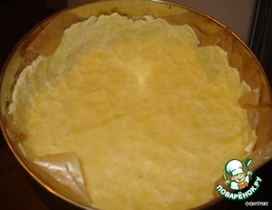 Раскатать тесто в тонкий пласт и выложить в застеленную пергаментом разъемную форму диаметром 28 см таким образом, чтобы получились бортики высотой 2-3 см.