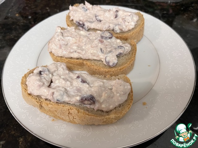 Маслины и лук нарезать, оставить немного для украшения. Смешать со сливочно-рыбной массой.