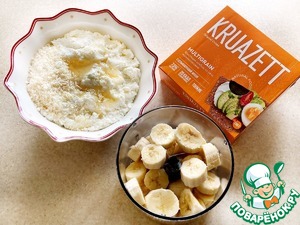 Также пюрируйте бананы. Соедините измельчённое с хлебцами печенье с бананами, добавьте какао и хорошо перемешайте. Творог протрите через сито или взбейте хорошо блендером. Добавьте мёд, кокосовую стружку и перемешайте.