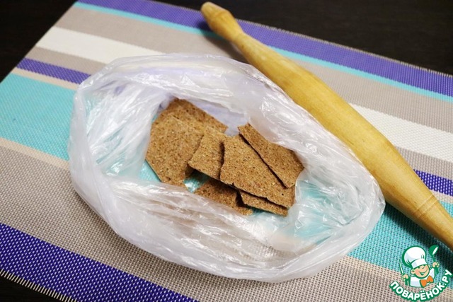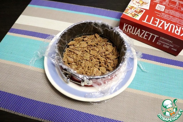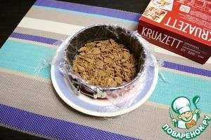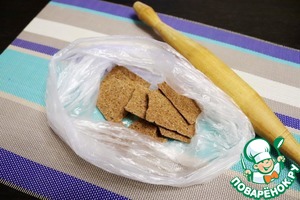 Измельчить хлебцы Kruazett, но не в муку, а так, чтобы кусочки остались. Это будет хлебная подложка под желе.