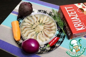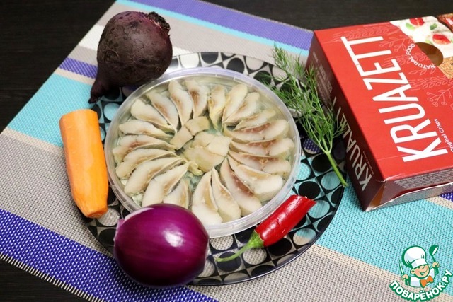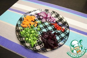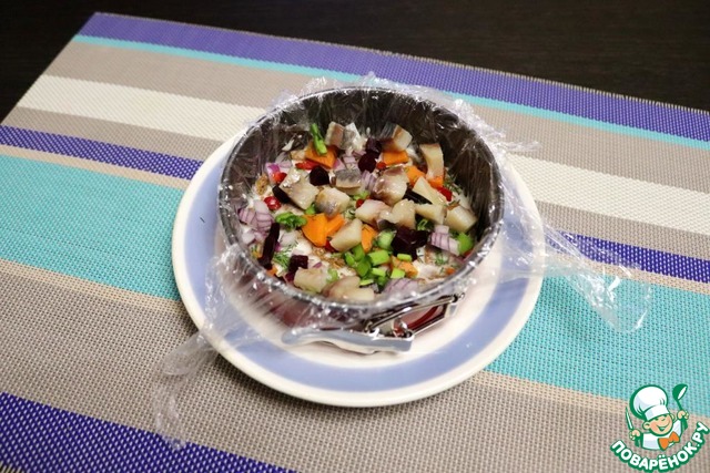 Для наполнителя тортика, помимо селедки, я взяла вареные свеклу и морковь, лук красный и зелёный, укроп и перец чили.