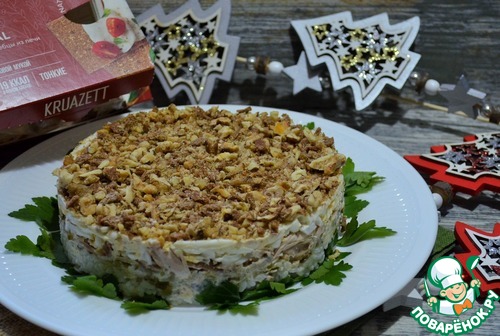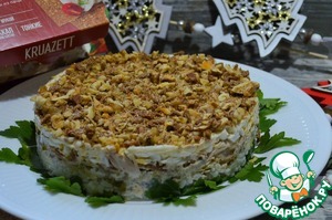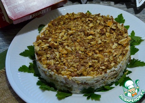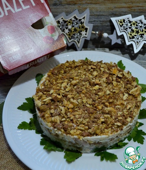 Праздничный салат, на столе его можно принять за торт. Нравится практически всегда и всем, сегодня я его дополнила хлебцами и это добавило вкуса, изменило в лучшую сторону. Рекомендую.