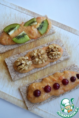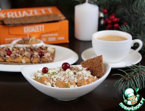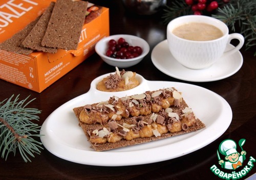 Готовый крем нанести на хлебцы Kruazett и по своему желанию посыпать сверху натертым шоколадом, миндальными лепестками, добавить ягоды. Одним словом, как душа пожелает.