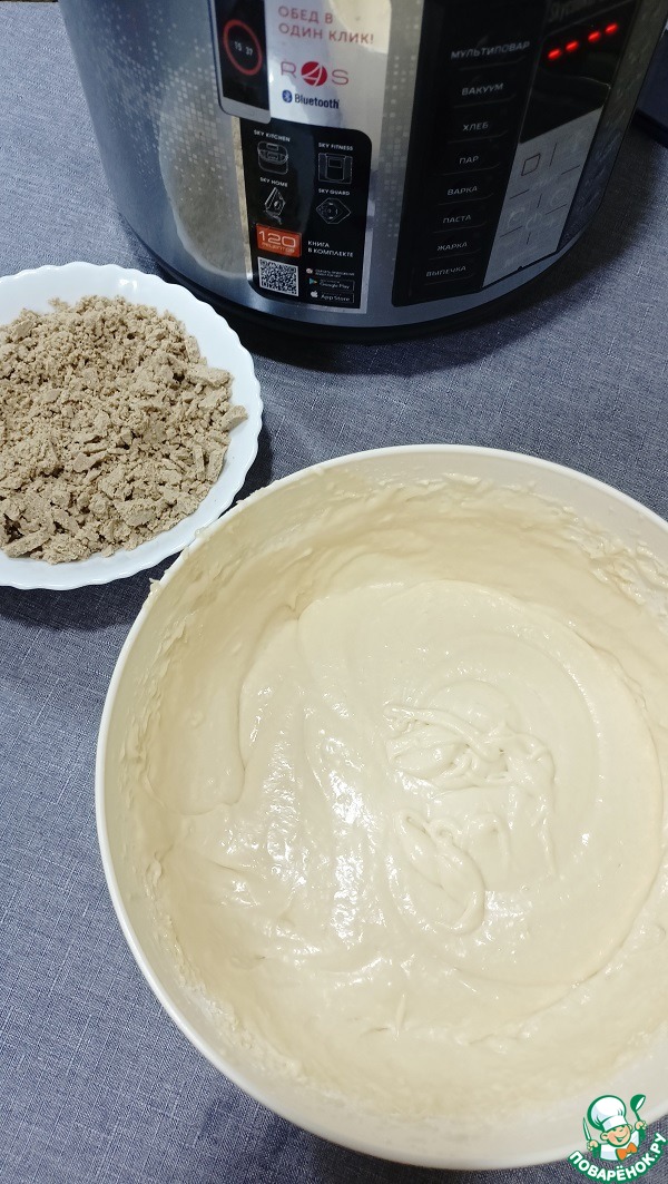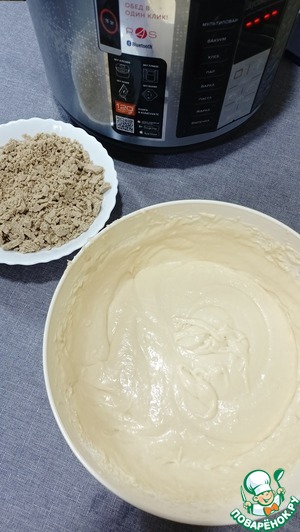 • Смазываем чашу масло (уйдет примерно 5гр) и отправляем в чашу полученное тесто, периодически высыпая халву — Режим «Выпечка» 60 минут.
