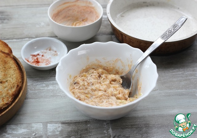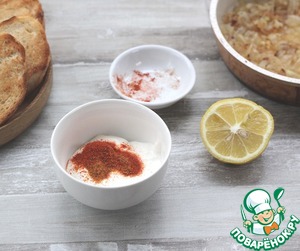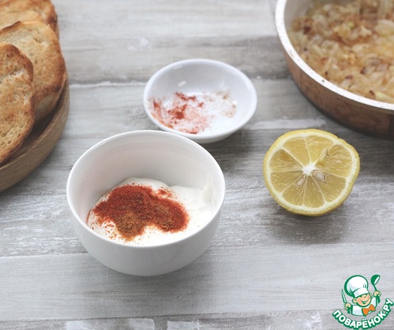 В чашке смешать сметану (можно заменить на густой йогурт), перец красный, паприку, соль, лимонный сок.
