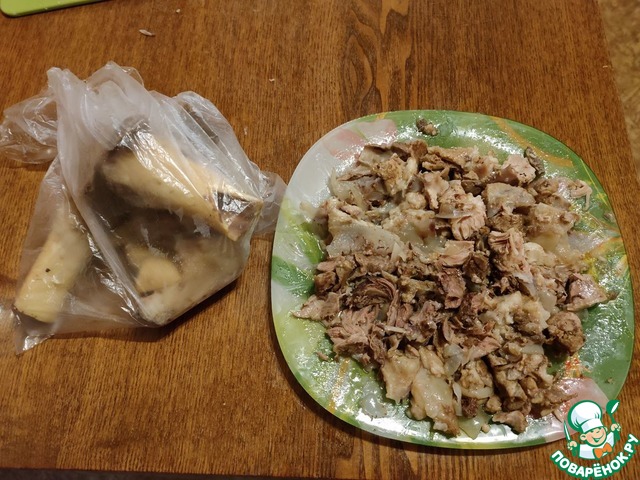 2. Достаём из сваренного бульона косточки, охлаждаем их и срезаем всё съедобное мясо. Режем его на порционные кусочки.