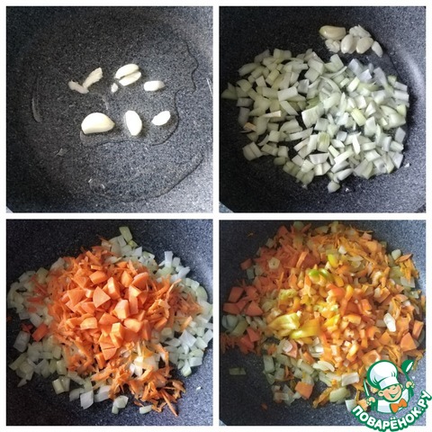 На сковороде греем масло подсолнечное рафинированное. Выкладываем чеснок, раздавленный плоской стороной ножа. Обжариваем его с минуту, чтобы он отдал свой аромат маслу. Чеснок убираем с сторону на сковороде. Выкладываем мелко резанный лук и золотим его до мягкости. Чеснок убираем (выкинем). Добавляем морковь. Я одну морковь натру на тёрке, а другую порежу мелким кубиком. Немного обжариваем, убавляем огонь на минимум, накрываем крышкой и тушим минуты 3. Выкладываем мелко порезанный перец болгарский и продолжаем тушить под крышкой, помешивая периодически.