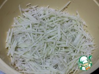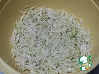 НИЧЕГО НЕ ГОТОВИМ ЗАРАНЕЕ!!! ЭТО ВАЖНО! Капусту нашинковать, разрезать на более короткие части. Слегка присолить, сильно перетереть руками и выложить в чашу. |