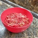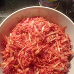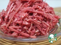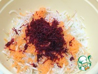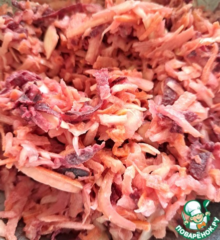 Очистить чеснок. Натереть на мелкой терке на яблоки. Морковь очистить и натереть на мелкой терке на чеснок. Свеклу очистить и натереть на мелкой терке на морковь. НЕ ПЕРЕМЕШИВАТЬ. |