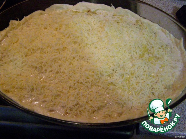 Трем 150 гр сыра на мелкой терке и засыпаем пирог.