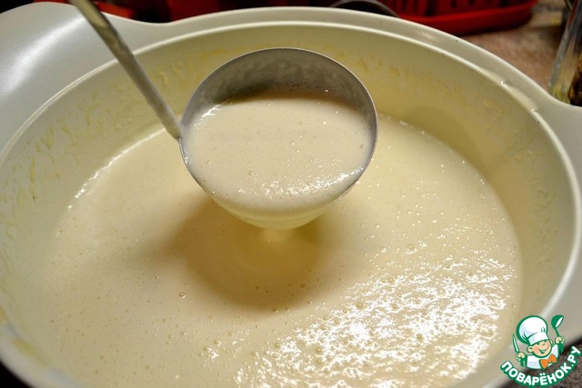 В тёплое молоко воды добавляю,4яйца, масла подсолнечного 3ст. ложки, муки, перемешиваю до состояния не густой сметаны, поднявшиеся дрожжи вмешиваем в тесто, следим чтоб не было комочков.