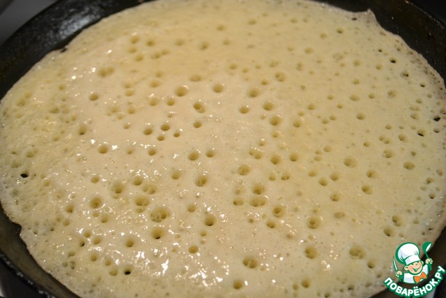 Тесто становится воздушным, таким образом у нас на блинчиках будет много дырочек! Наливаем готовое тесто на горячую сковородку тефлоновую без масла, (готовые смазываю сливочным маслом.. )тонким слоем...
