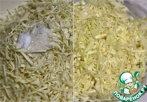 Нашинковать, значит, капусту тонко и мелко, добавить ложку столовую «с горкой» сахара, половинку чайной ложки соли, перемешать и помять слегка.