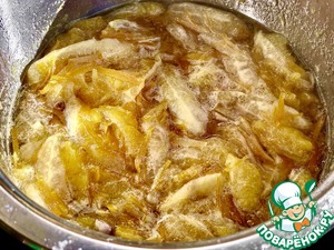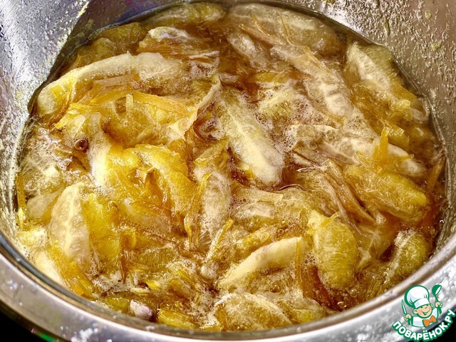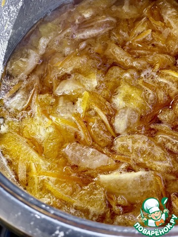 А потом цедру залил водой и поставил на плиту. Довел до кипения и убавил нагрев до минимума. Пусть очень спокойно побулькает минут пять. И слил воду. Т. е. поменял. Залил свежей водой и опять довел до кипения. Опять пять минут. Кипяток слил и залил цедру холодной водой.