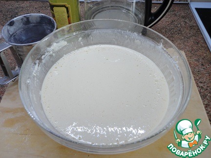 Влить ряженку и всыпать соду. Небольшими порциями начинаем просеивать муку, после каждой порции тщательно перемешиваем венчиком, чтобы не образовалось комочков. Тесто должно быть похоже на густую сметану. Включаем чайник.