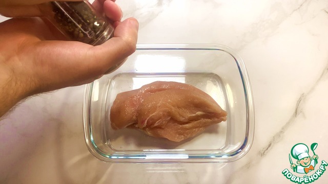 Первым делом куриное филе приправляем солью, черным молотым перцем, приправой для курицы, сушенным чесноком.