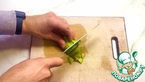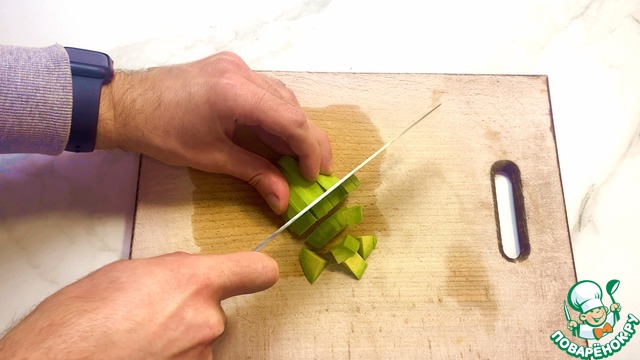 У авокадо убираем кожицу с косточкой и мякоть нарезаем небольшими кусочками.
