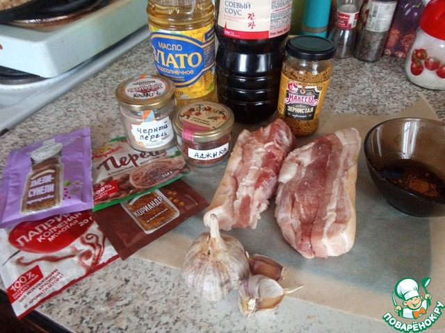 Для начала промываем нашу грудинку, обсушиваем и нарезаем на нужные нам кусочки. И занимаемся маринадом. Вот набор который получился у меня.