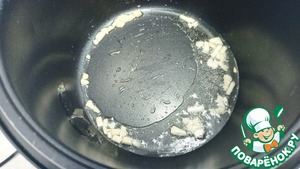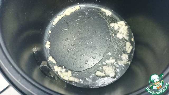 Отправляем в чашу чеснок и масло — Режим «Жарка» 4-5 минут. (Не забываем перемешивать каждые 2-3 минут). Желательно готовить с закрытой крышкой.