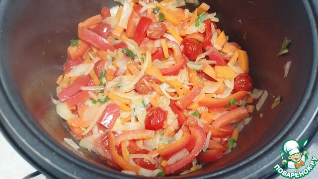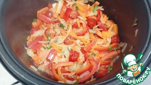 Добавляем в чашу помидоры, лук, морковь, перец и петрушку - Режим «Жарка» 12 минут. (Не забываем перемешивать каждые 3-5 минут). Желательно готовить с закрытой крышкой.
