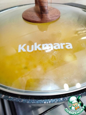 Накройте крышкой и варите до готовности. Дайте готовому супу настояться, около 10 минут. Здесь у меня похвастушки новой кастрюли от "Поварёнка" - приза за конкурс (сегодня получила), такая она классная!!!