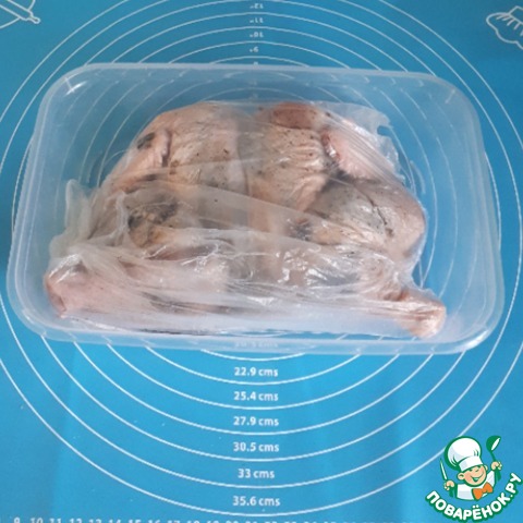 Поместить тушку в пакет и в контейнер с крышкой. Поставить мариноваться в холодильник на 12-24 ч.