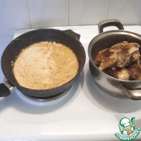 На этом этапе можно и закончить приготовление, но я предлагаю приготовить соус. Цыпленка переложить в другую емкость, а в сковороду, к тому что осталась после жарки, добавить сметану, долить немного воды (50-70 мл) и довести до кипения.