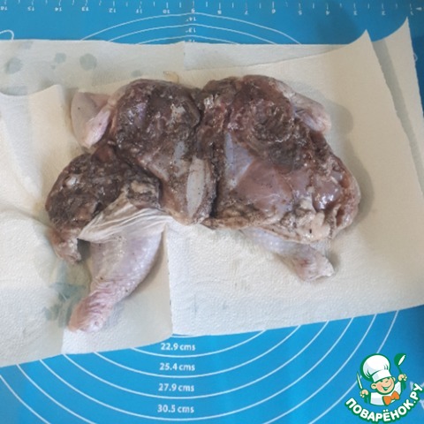 Воду слить, тушку обсушить бумажными полотенцами.