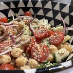 Нут высыпать в чашу, добавить порезанные на половинки черри, зелень и огурцы.