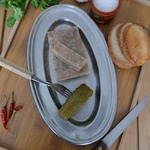 Решил съесть этот кусочек на завтрак. Люблю есть холодец именно с горчицей, хотя можно использовать ещё хрен, аджику или другие острые приправы.
