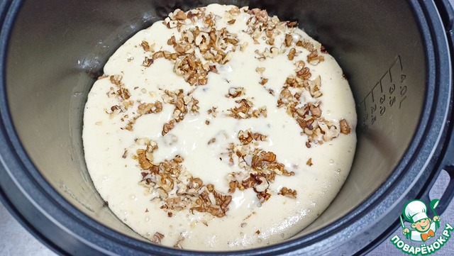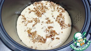 Смазываем чашу масло (уйдет примерно 5гр) и отправляем в чашу полученное тесто, периодически высыпая орехи — Режим «Выпечка» 60 минут.