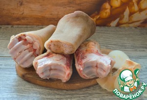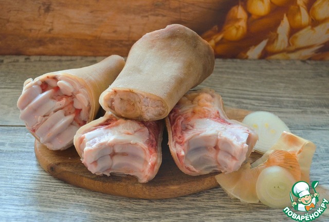 Говяжью ногу почистить, тщательно промыть, разрезать по суставам на две части. Длинную разрубить на две части ( можно распилить), часть с копытами разрезать вдоль пополам.
