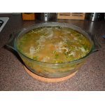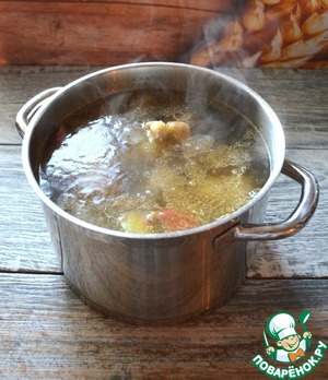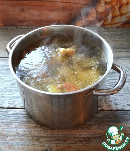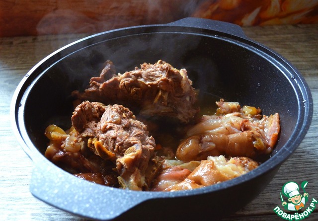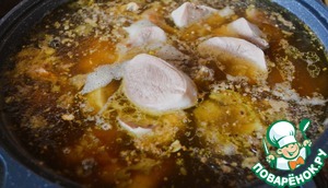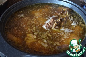 Залить процеженным бульоном от ног, при необходимости добавить бульон от мяса, варить на медленном огне.